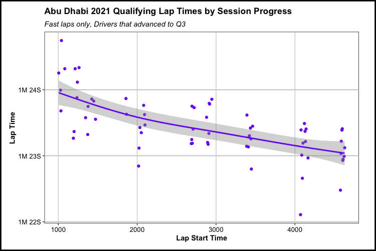 With a descriptive analysis such as this one - the exact rankings of how much track evolution each circuit experienced during qualifying can and definitely should be up for debate. However, I feel comfortable enough in using this as a directional tool for how a lot of circuits behaved last year. Perhaps a bit too pronounced in the model, but I especially enjoy the Saudi Arabia track evolution, as it is evident how drivers were still adapting to a new track in the beginning of the evening session, then the setting sun rapidly cooled the track and therefore decreased lap times towards the end of qualifying. To close, one fallback of this particular analysis is really the lack of Apples-to-Apples lap data to create robust models for - as in throwing out all practice and race lap data in favor of qualifying. F1 teams have far more internal data at their disposal to inform their decisions for simple things like track evolution, but I hope that this at least gives some insight in walking through an analysis from data acquisition, to cleaning, and plotting. Until next time, cheers!