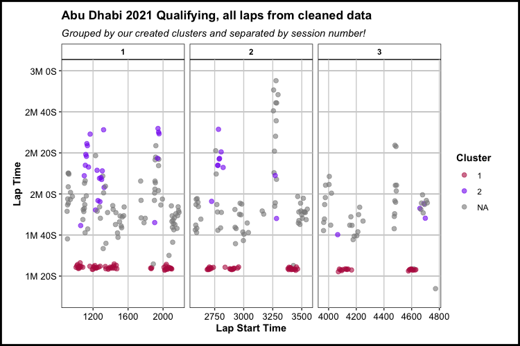 The important function below is compile_driver_data that is being called within the the purrr package’s map_df function. Within compile_driver_data are a series of created functions that serve to clean and cluster the data, which was seen earlier in this analysis. This is just an extra tool to apply that code, plus some additional code to deal with the intricacies that come from other qualifying sessions (mainly red flags that cause one or more prolonged stoppages), to an entire season of qualifying sessions.